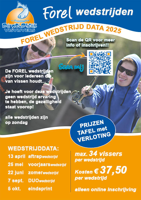 Ook dit jaar houden we weer meerdere forelwedstrijden, je hoeft voor deze wedstrijden geen wedstrijd ervaring te hebben, de gezelligheid staat voorop! Alle wedstrijden zijn op zondagmiddag. Loting vanaf: 12.00 uur De nummers 1 t/m 3 mogen een prijs uitkiezen van de prijzentafel en de rest van de prijzen worden verloot onder andere deelnemers. WIE GAAT ER IN 2025 MET DE WISSEL TROFEE VANDOOR? Bij iedere wedstrijd worden er ook punten verdeeld, de punten van de 4 best geviste wedstrijden (bij elkaar opgeteld) gelden voor het puntenklassement voor de Woldstek (wissel)Trofee! De eerste en laatste wedstrijd dubbele punten!! Je mag dus 1 wedstrijd laten vallen, maar dit hoeft niet. Max. 34 deelnemers!