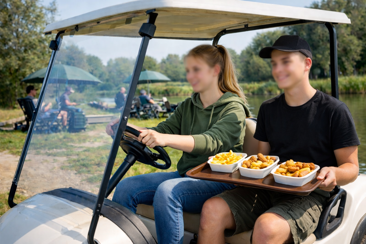 Je hoeft niet meer te wachten tot we langskomen met gehaktballen en drinken! Op meerdere plekken aan de vijver (boven de afvalbakken) hangen QR-codes. Ook staat er een QR-code op de bon die je krijgt bij het aanmelden. Kies wat je wilt bestellen en bel je bestelling door naar 0522 - 45 21 55.
