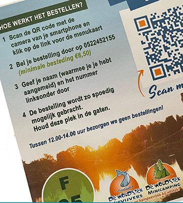 Op meerdere plekken aan de vijver (boven de afvalbakken) hangen QR code's, ook staat deze op de bon die je ontvangt bij aanmelden, door deze QR code te scannen met de camera van je smartphone en op de link te klikken, open je de menukaart, hier kun je kijken wat je wilt bestellen en dit kun je doorbellen op 0522452155, de bestellen wordt dan zo spoedig mogelijk gebracht bij je aan de vijver.